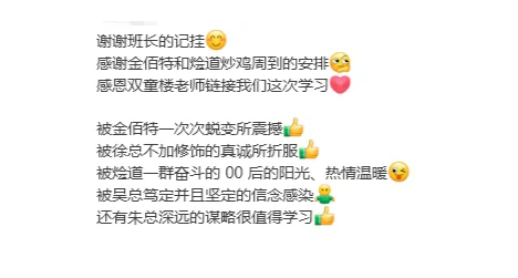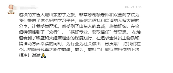 本次的山東校友會研學(xué)專場落下帷幕,圓滿收官!山東燴道的企業(yè)文化與成長之路也獲得了同學(xué)們的高度好評,大家紛紛在返程時留下了發(fā)自肺腑的真誠反饋!