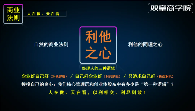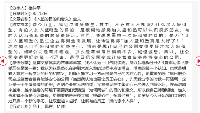 至于品德,只有長期的考驗才能被檢驗,所以需要通過價值觀引導和制度約束來加以修正。這也是雙童“回歸”盛和塾的意義所在!最后,他在發(fā)言中振臂高呼,鼓舞號召大家從今天開始放下自己,放下過往,從“新”開始,追隨塾長!