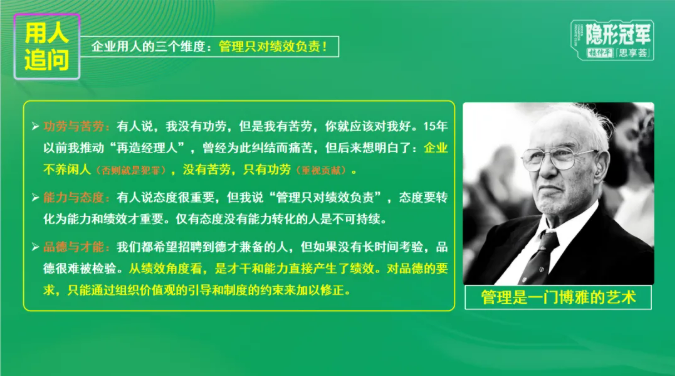 管理學(xué)者們都對用人有一些觀點傾向,而對于是“用人所長”還是“視人所短”,樓老師認(rèn)為是“妥協(xié)大于平衡”,終極思考應(yīng)該是如何找到或培養(yǎng)更多“不需要管理的人”。
