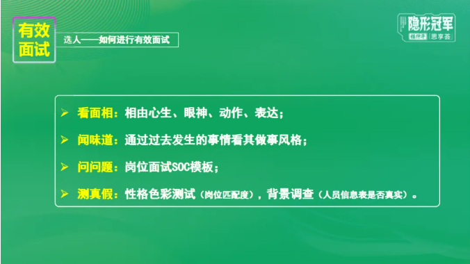 他還分析了“內(nèi)部選拔”與“外部招聘”的優(yōu)劣勢及適用場景,強調(diào)企業(yè)應(yīng)基于發(fā)展階段靈活選用策略。針對“空降兵”這一典型現(xiàn)象,李老師指出成功的關(guān)鍵在于立“共生關(guān)系”:前三個月應(yīng)多觀察、少主導,以技術(shù)專長協(xié)助其他部門,逐步建立信任、推動變革,最終實現(xiàn)團隊融合。