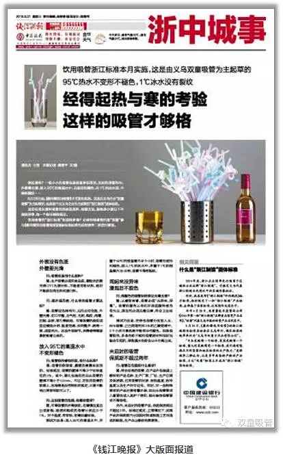 8月26日,由“雙童”主導(dǎo)起草的“浙江制造”團(tuán)體標(biāo)準(zhǔn)《聚丙烯飲用吸管》正式發(fā)布實(shí)施!這份標(biāo)準(zhǔn)從塑料吸管的形態(tài)到原料、檢測(cè)方法、耐熱多少度以下不能變形等,每一個(gè)細(xì)節(jié)都有明確的規(guī)定。消息一出,引起了新聞媒體的高度關(guān)注。這不,浙江的權(quán)威媒體《錢江晚報(bào)》對(duì)此也進(jìn)行了大版面報(bào)道,下面妞就帶大家來看看吧!