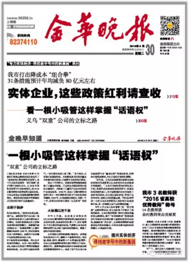 【爆了!十幾家媒體爭(zhēng)先報(bào)道“雙童”!】《金華晚報(bào)》頭版關(guān)注“雙童”的立標(biāo)之路:看一根小吸管這樣掌握“話語(yǔ)權(quán)”!