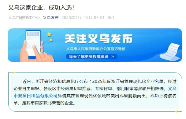 近日,義烏市雙童日用品有限公司成功入選“2025年度浙江省管理現(xiàn)代化企業(yè)”,成為義烏市首家獲此榮譽(yù)的企業(yè)。該消息由《義烏發(fā)布》隆重報(bào)道!