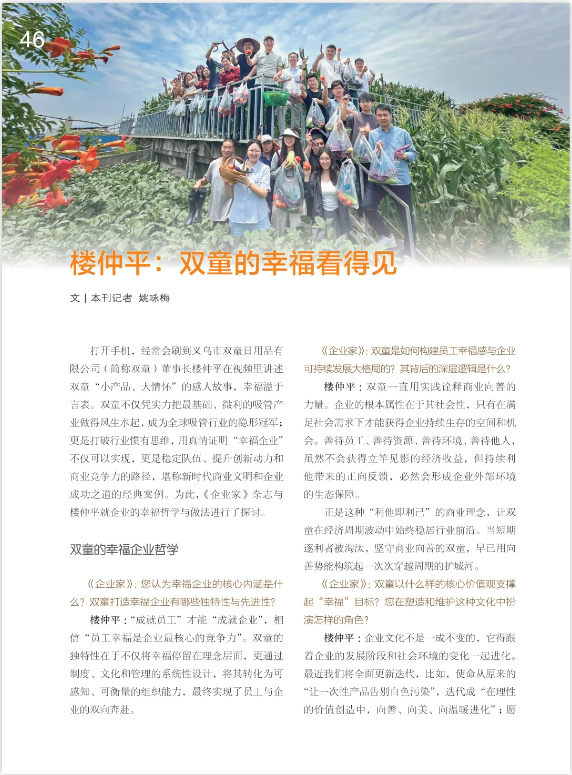《企業(yè)家》:雙童是如何構(gòu)建員工幸福感與企業(yè)可持續(xù)發(fā)展大格局的?其背后的深層邏輯是什么?