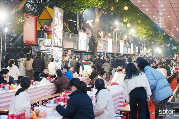 現(xiàn)場處處洋溢著溫馨與歡樂:烤串在爐火上滋滋作響,孜然香氣隨風飄散;鹵味攤前始終人氣不減,鴨頭酥香、炒粉鍋氣十足,讓人吃得暢快淋漓。甜品區(qū)則是孩子們的樂園,切糕扎實、蛋糕綿密,一張張小臉上寫滿了滿足。長桌上,從梅干菜餅到牛肉飯,天南地北的美食在此匯聚,笑語與食物的熱氣一同在林間縈繞,繪成一幅溫暖生動的歲末歡聚圖景。