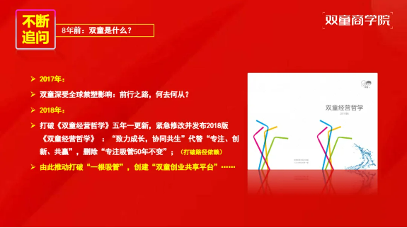 《雙童經(jīng)營(yíng)哲學(xué)》是在持續(xù)追問中逐漸成形的,雙童創(chuàng)始人樓仲平認(rèn)為,人類與企業(yè)的成長(zhǎng)皆源于解決問題,是問題倒逼思考與進(jìn)化。