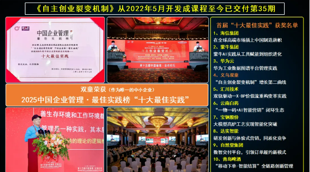 源于2015年前后,吸管產(chǎn)業(yè)面臨增長“天花板”,疊加全球禁塑浪潮沖擊,企業(yè)陷入存亡危機(jī)時,樓仲平基于“以機(jī)制撬動人效”的思路,在數(shù)字化環(huán)境下創(chuàng)新組織架構(gòu),探索出《自主創(chuàng)業(yè)裂變機(jī)制》,開展了一場立足中國中小企業(yè)現(xiàn)實(shí)的組織創(chuàng)新實(shí)踐。