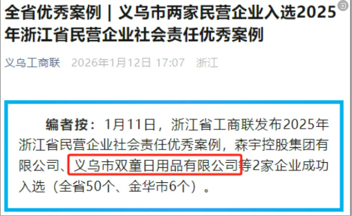 近日,浙江省工商聯(lián)正式發(fā)布2025年浙江民營企業(yè)社會責任報告優(yōu)秀案例名單,雙童憑借在綠色發(fā)展、共同富裕和公益慈善等領域的扎實實踐,成功入選“2025浙江民營企業(yè)社會責任優(yōu)秀案例”,成為義烏唯二的入選企業(yè)!