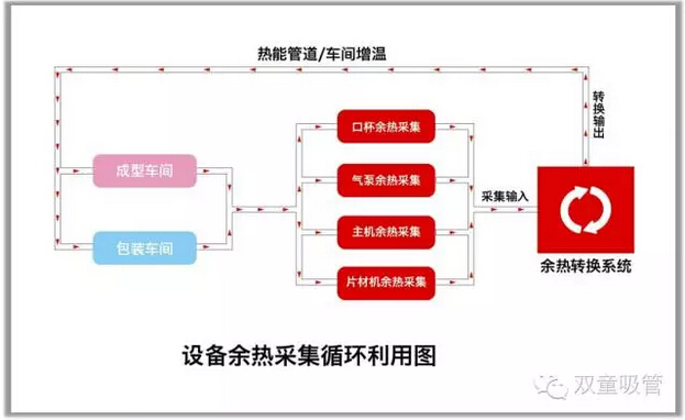 “雙童”采用引用的日本技術(shù)對(duì)所有生產(chǎn)設(shè)備的余熱和廢氣進(jìn)行采集并回收,再通過空調(diào)管道輸送到需要加溫的各個(gè)車間和工段,在減少大量工業(yè)排放同時(shí)也為企業(yè)節(jié)省了大量的空調(diào)電耗支出,對(duì)所有經(jīng)過模具的50度溫水進(jìn)行收集并供應(yīng)到所有寢室的衛(wèi)生間給員工洗澡洗衣用,從而徹底消除鍋爐,節(jié)省了大量煤電資源和人工管理,降低了工業(yè)排放和煤炭污染。