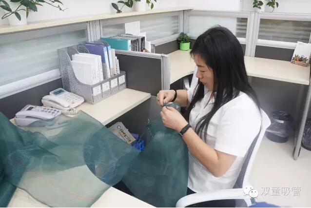 為此,我們的辦公室還發(fā)掘出了一批“繡娘”呢!辦公室的女同胞們在吸管妞的組織下,全都手工縫制起了用于裝置活性炭的細網袋子!2016年最新款“雙童”手工袋,全球限量發(fā)行,你值得擁有!