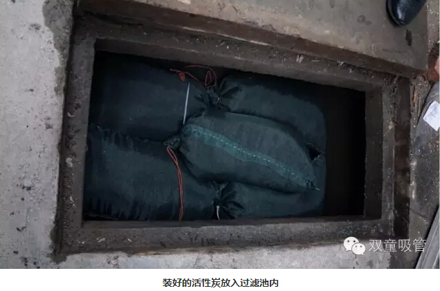 快看,這就是傳說中的活性炭!我們將它分裝到一只只由細網縫制的袋子里,作為廢水處理系統(tǒng)中的過濾芯,用來過濾廢水!裝好的一袋袋活性炭放入過濾池中,經過的廢水就會進行過濾處理和氧化沉淀。每個池子都足足填了六七十只活性炭袋,才把過濾池填滿!粗粗一算,我們整整用了兩噸的活性炭呢!
