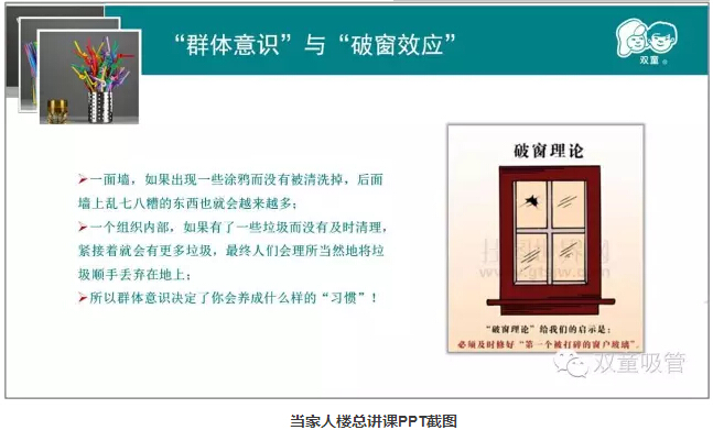 今年以來,“雙童”一直在對(duì)公司的硬件按五星級(jí)的標(biāo)準(zhǔn)進(jìn)行再次的提升,不過,我們可不是傳說中的“人傻錢多”哦!在發(fā)展初期,我們以前的硬件完全可以滿足我們的管理需要,但現(xiàn)如今,“雙童”要實(shí)現(xiàn)90分向99分的突破和進(jìn)步,提升員工的質(zhì)量意識(shí),那就必須提升公司的硬件投入!在硬件提升的背后,就是為了規(guī)避“破窗效應(yīng)”!接下來吸管妞就向大家闡釋一下當(dāng)家人樓總在經(jīng)營“雙童”的過程中是如何規(guī)避“破窗效應(yīng)”,形成好的“群體意識(shí)”,從而提升員工質(zhì)量意識(shí)和個(gè)人素質(zhì)!
