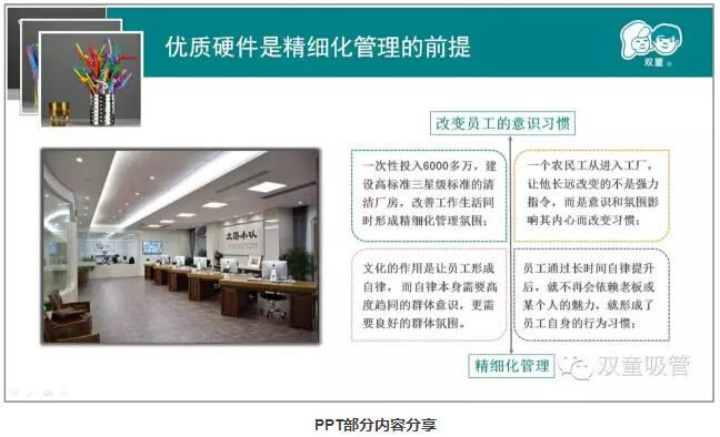 “雙童”在建廠之初就將所有的寢室按三星級(jí)的標(biāo)準(zhǔn)進(jìn)行裝修,今年我們的廚房餐廳、車間衛(wèi)生間也按五星級(jí)的標(biāo)準(zhǔn)裝修進(jìn)行再次提升。其實(shí),這就是在慢慢改變員工的意識(shí)形態(tài),在改善工作生活的同時(shí)形成精細(xì)化管理氛圍。員工通過長時(shí)間自律提升后,就不再會(huì)依賴?yán)习寤蚰硞€(gè)人的魅力,就形成了員工自身的行為習(xí)慣。