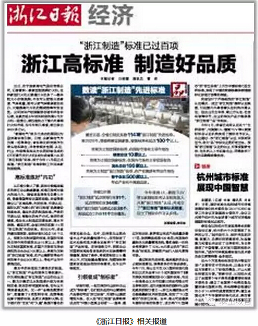 2014年底,浙江在全國率先以標(biāo)準(zhǔn)和認(rèn)證為手段打造首個區(qū)域性公共品牌——“浙江制造品牌。浙江制造標(biāo)準(zhǔn)比國家及行業(yè)標(biāo)準(zhǔn)要求要高,基本達(dá)到國際先進(jìn)、國內(nèi)一流水平。通過制定先進(jìn)標(biāo)準(zhǔn),越來越多的企業(yè)占領(lǐng)標(biāo)準(zhǔn)高地,獲得更多的市場話語權(quán)。近日,《浙江日報》也發(fā)布了一篇《浙江高標(biāo)準(zhǔn),制造好品質(zhì)》的報道。