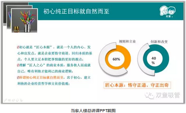 “初心”是匠心本源,初心就是做某件事的初衷,它決定了人的價值觀!唯有對社會有利的企業(yè)才能長期生存,初心是企業(yè)最需要堅持的東西,只有初心存正,目標(biāo)才會自然而至。匠心本質(zhì)是自私的,在一定程度上“自私”又是偉大的,自私是建立在利他的基礎(chǔ)上。 “雙童”在建廠之初建設(shè)節(jié)能降耗措施,讓員工住三星級寢室都是基于初心,在利他的前提下追求自我價值的體現(xiàn),讓企業(yè)和員工更好!