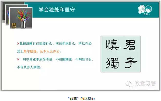 “恒心”是用長遠(yuǎn)的眼光去看問題,我們強(qiáng)調(diào)戰(zhàn)略思考、戰(zhàn)略規(guī)劃、戰(zhàn)略部署,唯獨(dú)缺少戰(zhàn)略耐心。“雙童”堅持小客戶原則,堅持對員工投入,堅持走差異化的道路,“雙童”的發(fā)展也越來越好。創(chuàng)新就是改變,就是持續(xù)積累。創(chuàng)新需要戰(zhàn)略耐心,需要十年為一個單位的恒心。