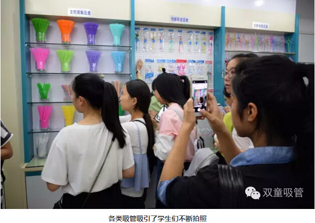 移步樣品房,展柜上陳列著愛心吸管、風(fēng)車吸管、卡通吸管……學(xué)生們看到如此琳瑯滿目的吸管后都十分感興趣,直呼:一根吸管都有這么多的創(chuàng)意真棒呀!