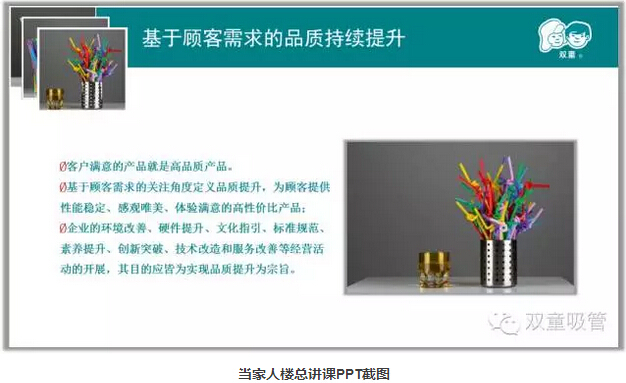 首先,當(dāng)家人樓總對雙童過去的五年發(fā)展規(guī)劃,及雙童發(fā)展前后十年進(jìn)行了對比與總結(jié)。2005年,雙童提出了第一個(gè)五年發(fā)展規(guī)劃,其中提到了三個(gè)關(guān)鍵詞專注發(fā)展、創(chuàng)新提升、資源最大化,在這期間,雙童始終堅(jiān)持以小博大的理念,沒有貪大求全,急功近利,專注做好一根吸管。