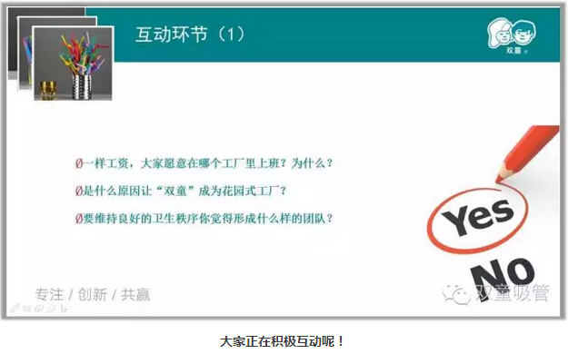 這不,一開場當家人就讓妞發(fā)起了紅包福利,在看到雙童與一般企業(yè)的餐廳、寢室等硬件的對比之后,互動真是停不下來啦!一樣工資的情況下,大家愿意在哪個工廠上班?要維持良好的衛(wèi)生秩序你覺得要形成什么樣的團隊?