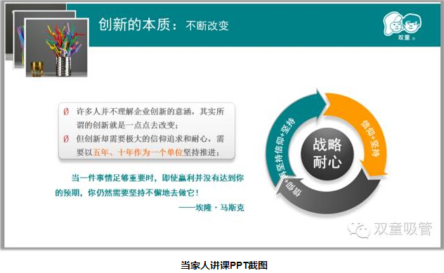 “不要嫌虧幾百萬少,‘雙童得做多少根吸管,才能掙出這幾百萬來!”樓仲平說,企業(yè)轉(zhuǎn)型的這個(gè)過程,是一個(gè)以10年為單位的周期,這實(shí)在是考驗(yàn)一個(gè)企業(yè)的恒心。