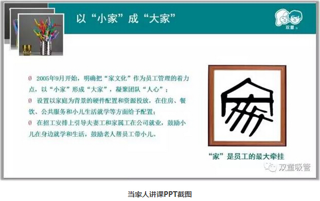 當(dāng)家人樓總始終認(rèn)為只有員工幸福企業(yè)才能幸福,只有改變員工才能改變產(chǎn)品從而改變企業(yè)。雙童意識到人心管理就是人性的需求管理,是企業(yè)生態(tài)系統(tǒng)建設(shè)的源頭問題。所以雙童明確把家文化作為員工管理的著力點(diǎn),以小家形成大家。除了給員工提供優(yōu)質(zhì)硬件,從生態(tài)上保障員工珍惜環(huán)境所在,同時(shí)通過意識引導(dǎo)、規(guī)則管理讓員工的觀念進(jìn)行轉(zhuǎn)變,從而用生產(chǎn)出更好的產(chǎn)品!