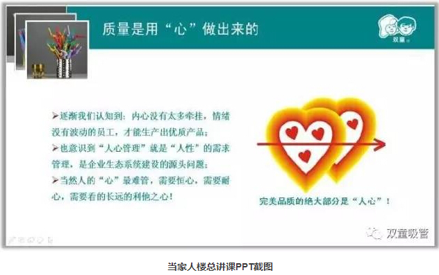 “雙童”逐漸認知到:“家”是員工最大的牽掛,只有改變員工才能改變產品從而改變企業(yè)。“人心”最難管,員工沒有了牽掛,才能全身心投入到工作當中,才能做出更加完美精細的產品,人心管理就是企業(yè)生態(tài)系統(tǒng)的改善。從2005年9月開始,“雙童”明確把“家文化”作為員工管理的著力點,以“小家”形成“大家”,凝聚團隊“人心”!