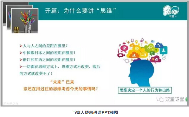 課程開始后,當(dāng)家人樓總闡述了為何要和大家分享“匠人思維”的原因,思維決定了一個(gè)人的行為和出路,思維不改變,落后的方式就改變不了!中國(guó)和日本為何有差距,浙江與江西為何有差距?這些其實(shí)就是思維上的差別,從而影響了一個(gè)地方的發(fā)展。唯有改變思維,才能縮短差距。未來已來, 我們不能用過往的思維考慮今天的事情,樓總也希望通過今天的分享能夠給江西的企業(yè)主們一些啟發(fā)。