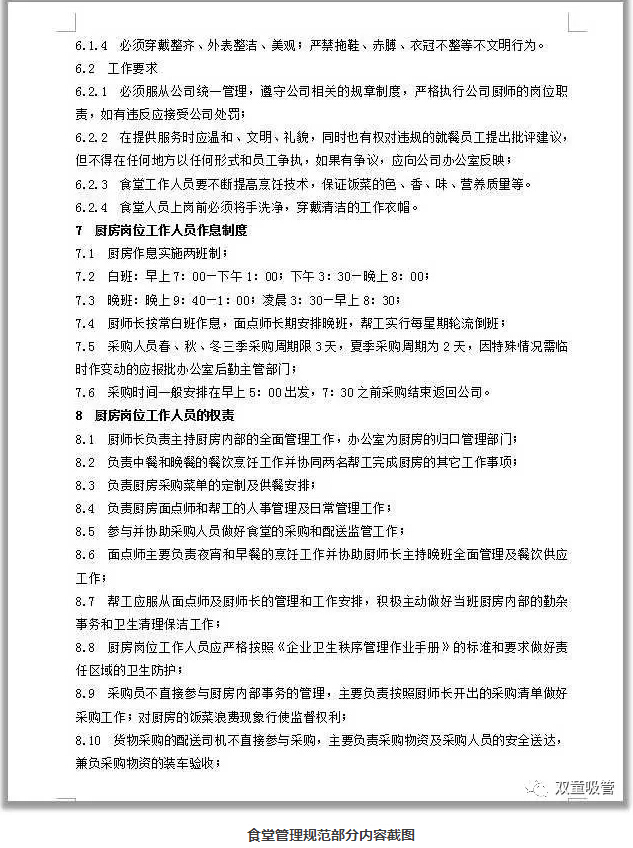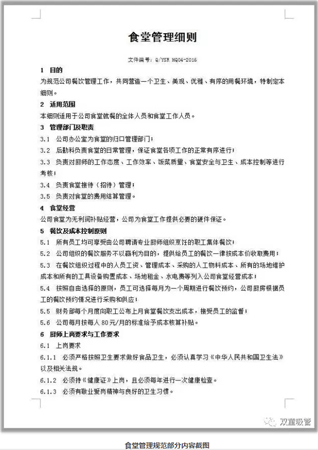 對于餐飲的管理,我們也有一系列的制度文件支撐!從1997年開始,“雙童”就對食堂進(jìn)行了規(guī)范管理,制定了很多的管理型文件!