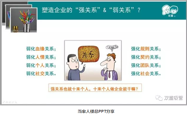 所以,我們要弱化血緣關(guān)系,強(qiáng)化規(guī)則關(guān)系:在“雙童”,雖然有非常多的小家庭,但我們制定了親屬回避制度,以規(guī)則來制定關(guān)系;弱化人情關(guān)系,強(qiáng)化契約關(guān)系;弱化個人關(guān)系,強(qiáng)化團(tuán)隊關(guān)系;弱化社交關(guān)系,強(qiáng)化社會關(guān)系:不要依賴管理者個人的交際關(guān)系,轉(zhuǎn)而形成以團(tuán)隊和企業(yè)組織、與政府、與媒體和相關(guān)組織形成的良性關(guān)系,從而弱化個人關(guān)系,強(qiáng)化組織關(guān)系!