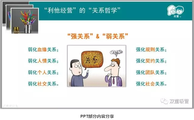 “利他經(jīng)營”的“關(guān)系哲學(xué)”:企業(yè)如何通過引導(dǎo)讓關(guān)系達(dá)到最優(yōu)配置?“雙童”樓仲平十分注重關(guān)系哲學(xué),通過弱化血緣關(guān)系,強(qiáng)化規(guī)則關(guān)系;弱化人情關(guān)系,強(qiáng)化契約關(guān)系;弱化個(gè)人關(guān)系,強(qiáng)化團(tuán)隊(duì)關(guān)系;弱化社交關(guān)系,強(qiáng)化社會(huì)關(guān)系,從而為企業(yè)持續(xù)發(fā)展創(chuàng)造良好條件!