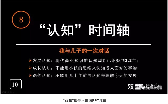 “認知”時間軸:“雙童”樓仲平通過自己與兒子的一次對話認知到不能用慣性思維來認知我們的下一代。樓仲平的成長也伴隨著不斷的否定,在認知、糾錯、不斷改變下實現(xiàn)自我成長。“創(chuàng)業(yè)者”最應(yīng)該有“時間軸”的概念,需要擁有自我蛻變的能力,否則你就很難成長!