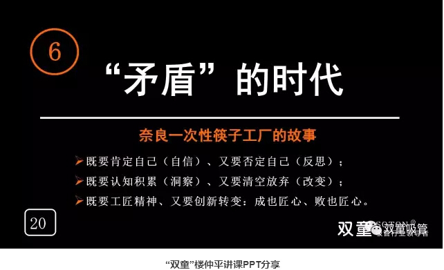 “矛盾”的時代:“雙童”樓仲平通過日本奈良一次性筷子的故事告訴大家成也工匠精神、敗也工匠精神,沒有改變,“工匠”精神也沒有用。作為創(chuàng)業(yè)者來講,我們不能用過往的經(jīng)驗來理解發(fā)生的一切,否則你會被時代所拋棄。在不同的時代,你對時間和技術(shù)進步的理解是不一樣的,既要肯定自己、又要否定自己;既要認知積累、又要清空放棄;既要工匠精神、又要創(chuàng)新轉(zhuǎn)變!