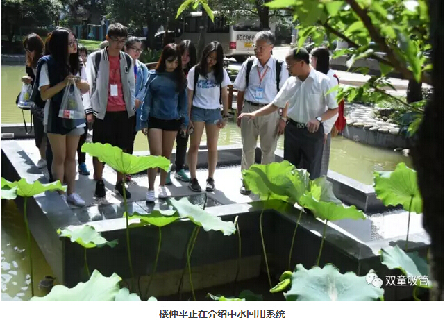 首先,大家一起參觀了中水景觀池、雨水收集池、垃圾分類房等節(jié)能降耗系統(tǒng)。其實(shí),早在2003年,樓仲平就向日本學(xué)習(xí),在建廠之初就把節(jié)能降耗和綠化生態(tài)想在了前面,建設(shè)了一套簡單實(shí)用的節(jié)能降耗系統(tǒng)。這些設(shè)施不僅減少了對環(huán)境的污染,每年還為企業(yè)節(jié)省了兩三百萬!使雙童成為了綠色生態(tài)、節(jié)能環(huán)保、無污染、零排放的花園式生態(tài)工廠。師生們紛紛表示原來以為大陸的企業(yè)都是薄利多銷,粗放經(jīng)營,想不到雙童在十幾年前就有如此環(huán)保節(jié)能的理念!