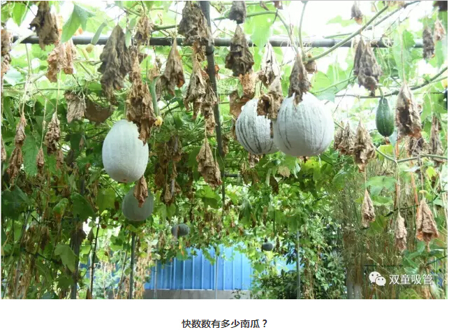 上個月,吸管妞和大家炫耀雙童屋頂菜園的第一波豐收。這不,現(xiàn)在雙童的屋頂菜園又有了新面貌,藤架上掛滿了一個個的瓜果,綠油油地一片,真惹人喜愛呀!