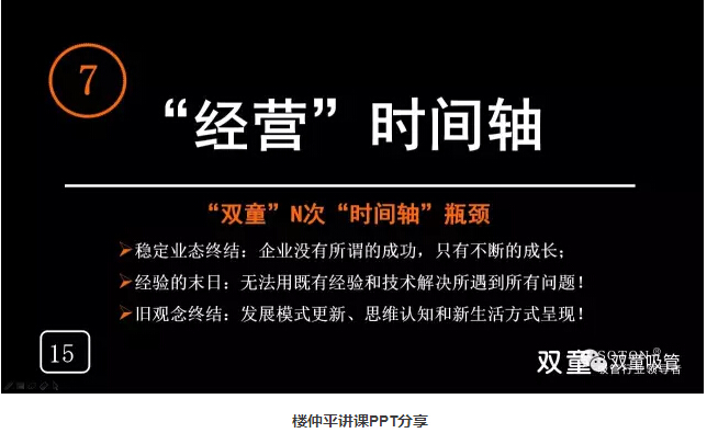 經(jīng)營時間軸:樓仲平也用雙童的發(fā)展史告訴大家經(jīng)營也是有時間軸的,會遇到瓶頸和天花板。企業(yè)沒有所謂的成功,只有不斷的成長,我們無法用既有經(jīng)驗和技術(shù)解決所遇到所有問題!