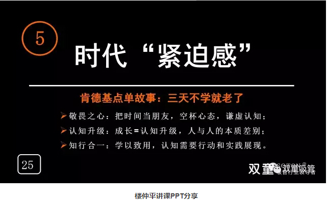 “認(rèn)知時間軸:雙童樓仲平通過自己與兒子的一次對話認(rèn)知到不能用慣性思維來認(rèn)知我們的下一代。樓仲平的成長也伴隨著不斷的否定,在認(rèn)知、糾錯、不斷改變下實現(xiàn)自我成長。創(chuàng)業(yè)者最應(yīng)該有時間軸的概念,需要擁有自我蛻變的能力,否則你就很難成長!