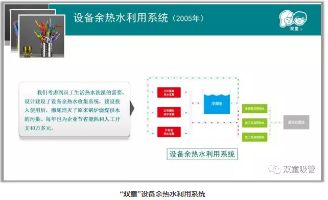 除此之外,“雙童”還設(shè)計(jì)了雨水收集系統(tǒng)、設(shè)備余熱水利用系統(tǒng)、設(shè)備余熱采集系統(tǒng)、垃圾分類等節(jié)能降耗設(shè)施,這些節(jié)能降耗設(shè)施不僅每年能為公司節(jié)省200多萬元的費(fèi)用支出,而且讓“雙童”成為了綠色環(huán)保的生態(tài)花園式工廠!