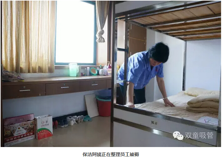 例如,每層寢室樓都配有專門(mén)打掃衛(wèi)生的阿姨,進(jìn)行衛(wèi)生間和寢室的日常打掃。保潔阿姨會(huì)將所有員工寢室的窗戶、衛(wèi)生間甚至垃圾桶等各個(gè)角落都擦拭干凈,垃圾不留過(guò)夜,就連員工的被褥每天也有阿姨進(jìn)行整理。