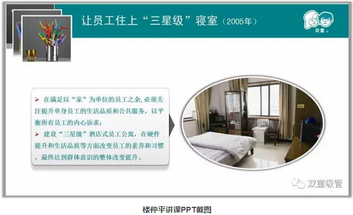 其實(shí),雙童樓仲平由于早年坎坷辛苦的創(chuàng)業(yè)經(jīng)歷,一直對(duì)農(nóng)民工感同身受,十分注重員工的吃住問(wèn)題。早在2012年,樓仲平就發(fā)布了一條關(guān)于員工住宿的微博,引起了極大的關(guān)注。微博上寫(xiě)道:自己住洋房別墅,卻讓員工住的像牛棚狗窩,你怎么能留得住員工?員工是企業(yè)的基礎(chǔ),對(duì)員工更好、企業(yè)反而會(huì)獲得更多!