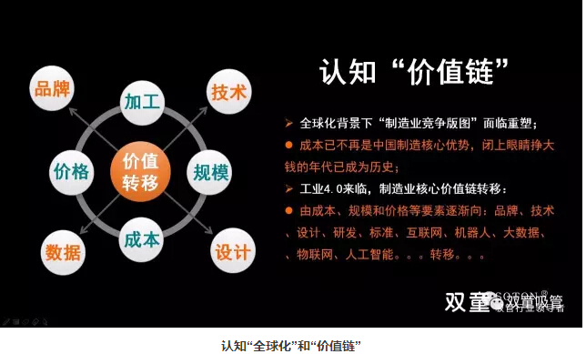 在全球化的背景下,成本不再是制造業(yè)的核心優(yōu)勢。企業(yè)必須面對時代的不斷變化,產業(yè)發(fā)展“棲”水草而居,中國制造商業(yè)競爭“價值鏈”轉移逐漸從“規(guī)模型”向“價值型”轉變。企業(yè)經營“核心價值鏈”轉移,由成本、價格、設備、產品等要素逐漸轉向品牌、渠道、標準、研發(fā)、數據、互聯網…… 傳統(tǒng)業(yè)主杯具時代已經來臨:經驗逐漸成為毒藥!