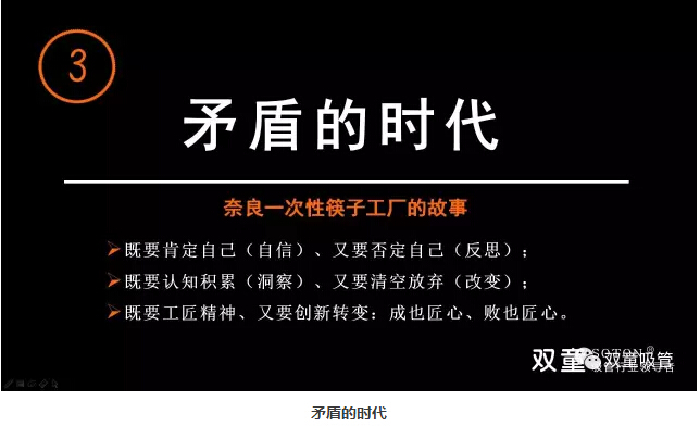 “雙童”樓仲平通過日本奈良一次性筷子的故事告訴大家成也工匠精神、敗也工匠精神,沒有改變,“工匠”精神也沒有用。作為創(chuàng)業(yè)者來講,我們不能用過往的經驗來理解發(fā)生的一切,否則你會被時代所拋棄。在不同的時代,你對時間和技術進步的理解是不一樣的,既要肯定自己、又要否定自己;既要認知積累、又要清空放棄;既要工匠精神、又要創(chuàng)新轉變!