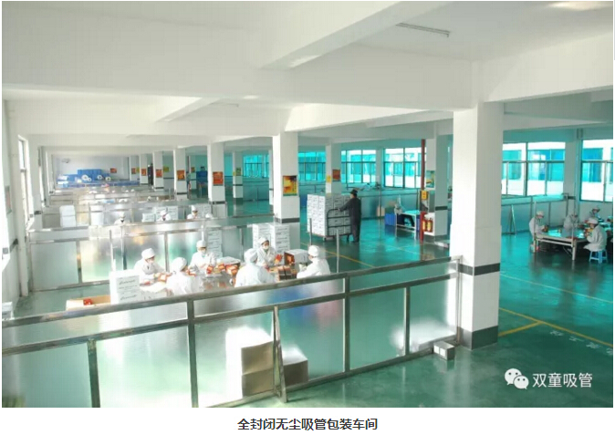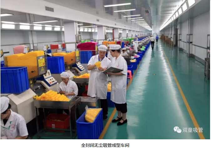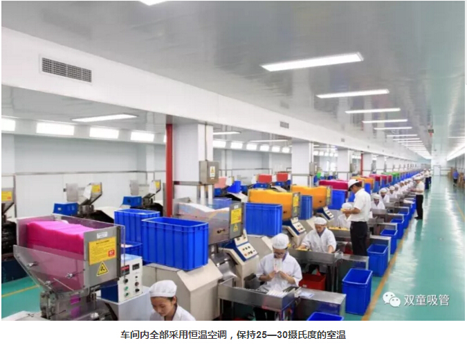 “雙童”車間的每個入口,有著許多安全、衛(wèi)生提示的標(biāo)牌,引導(dǎo)員工門在進(jìn)入車間時要注意安全和衛(wèi)生防護(hù)工作。進(jìn)入車間內(nèi)部,一列列整齊的機(jī)器、一箱箱五顏六色的吸管、一條條清晰分明的分界線,車間內(nèi)全部安裝了恒溫空調(diào),屋頂全部進(jìn)行精裝修寬敞明亮,柱子和地腳線用不銹鋼進(jìn)行包邊,大大增加了建筑年限。所有員工皆穿著潔白的工作服,正在忙碌地進(jìn)行生產(chǎn)工作。