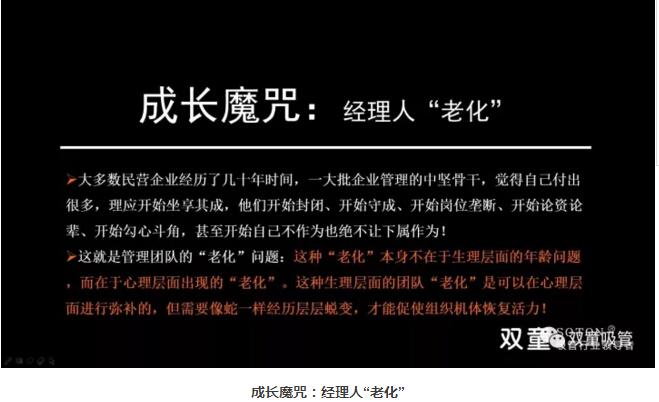 “雙童創(chuàng)辦初期聘任部分原國營企業(yè)的下崗管理層,這些人客觀上在企業(yè)發(fā)展中做出了巨大的貢獻。但到了2010年前后,其中的大部分管理層逐漸出現(xiàn)了認(rèn)知時間軸瓶頸:他們依托于習(xí)慣思維,完全憑經(jīng)驗用老方法解決新問題,不愿意學(xué)習(xí),創(chuàng)新意識低下,抵制變革,拒絕接受和應(yīng)用新興事物,團隊的成長遇到了瓶頸。
