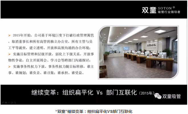 基于時代的改變和挑戰(zhàn),雙童2015年對組織形式做出新的變革,打破行政管理籬笆,通過平等、透明、開放的辦公環(huán)境,消除部門之間的隔閡,實施目標(biāo)管理和層級開放,弱化上下級關(guān)系,自主開展周會等跨部門溝通探討,提升部門工作效率。同時,實施事務(wù)性權(quán)力下放,大家以解決事務(wù)為核心,讓權(quán)力隨事務(wù)轉(zhuǎn)移,誰主事、誰規(guī)劃;誰負(fù)責(zé)、誰召集;誰承擔(dān)、誰受益,一切以工作結(jié)果為導(dǎo)向,也實現(xiàn)了跨部門互通互聯(lián)、共同探討!
