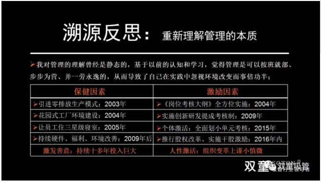 “雙童經(jīng)歷團隊蛻變后,通過學(xué)習(xí)會意識引導(dǎo)、推動家文化人性管理以及全方位改善員工的生活生產(chǎn)環(huán)境,提升團隊認(rèn)知意識和凝聚力!經(jīng)歷蛻變后團隊凝聚力確實有所提升,但客觀上基層員工的流動性依然較大,對高端人才引進還是沒有太大吸引力,企業(yè)的持續(xù)發(fā)展明顯存在著天花板瓶頸。