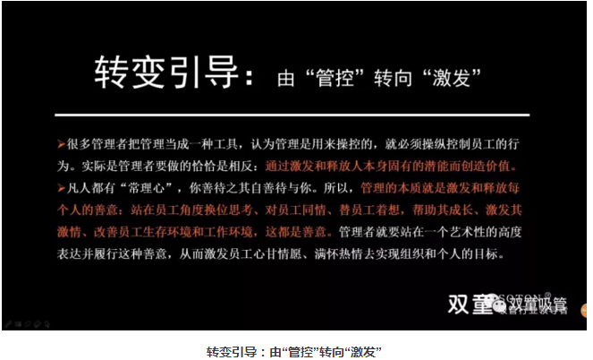 管理的本質(zhì)是管事而非管人,通過愿景展現(xiàn)、目標(biāo)設(shè)立、規(guī)則訂立和激勵兌現(xiàn)來引導(dǎo)員工將組織目標(biāo)轉(zhuǎn)化成個人目標(biāo),自愿而高效地給予完成,從而實現(xiàn)組織和個體的價值創(chuàng)造和共贏。同時,通過培訓(xùn)、授權(quán)和激勵,激發(fā)和釋放人本身固有的潛能而創(chuàng)造價值。所以,管理的本質(zhì)管理不是管控、教條和賦予,而是在共同完成組織和個體目標(biāo)的過程形成的默契,在共同追求中形成一致的價值和理念認(rèn)同。