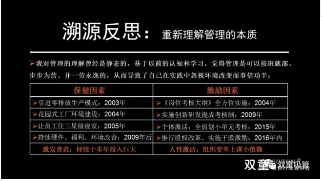 溯源反思,重新理解管理的本質(zhì):樓仲平分享道:“我對管理的理解曾經(jīng)是靜態(tài)的,基于以前的認知和學習,覺得管理是可以按部就班、步步為營、并一勞永逸的,從而導(dǎo)致了自己在實踐中忽視環(huán)境改變而事倍功半。”現(xiàn)在,樓仲平也一直在反思,重新理解管理的本質(zhì)!