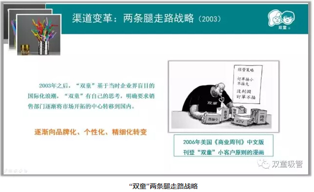 同時(shí),“雙童”也利用互聯(lián)網(wǎng)的優(yōu)勢(shì),先后投入數(shù)千萬資金用于“雙童”品牌的塑造和國(guó)內(nèi)市場(chǎng)的渠道建設(shè),持續(xù)尋找如酒店、夜總會(huì)、KTV、咖啡廳等中高端消費(fèi)場(chǎng)所的小訂單,爭(zhēng)取到了大量原被傳統(tǒng)制造企業(yè)忽視的小客戶群體,開始實(shí)施“小客戶原則”的經(jīng)營(yíng)戰(zhàn)略。