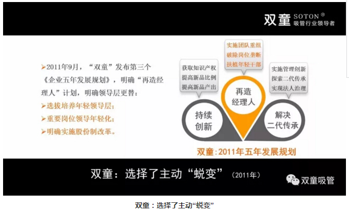 公司創(chuàng)辦初期聘任部分原國營企業(yè)的下崗管理層,這些人客觀上在企業(yè)發(fā)展中做出了巨大的貢獻。但2010年前后,其中的大部分管理層逐漸出現(xiàn)了“認知時間軸瓶頸”,他們完全憑經(jīng)驗用老方法解決新問題,拒絕接受和應用新興事物,團隊的成長遇到了瓶頸。因此,“雙童”決定重新梳理團隊,在2011年發(fā)布了第三個《企業(yè)五年發(fā)展規(guī)劃》,明確“再造經(jīng)理人”計劃,明確領導層更替:選拔培養(yǎng)年輕領導層、重要崗位領導年輕化、明確實施股份制改革,慢慢解決管理層老化問題!重組后的“雙童”團隊平均年齡不到三十歲,大部分核心團隊的工齡在十年以上,學歷、知識層次和忠誠度大幅提高!