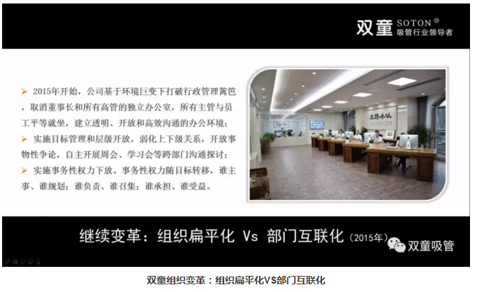 在團隊重塑之后,為了提高團隊溝通效率。“雙童”從2015年開始,對原有組織形式進行思考、實踐和探索,逐漸打破行政管理籬笆,通過平等、透明、開放的辦公環(huán)境,消除部門之間的隔閡,實施目標管理和層級開放,弱化上下級關系,自主開展周會等跨部門溝通探討,提升部門工作效率。同時,實施事務性權力下放,大家以解決事務為核心,讓權力隨事務轉移,誰主事、誰規(guī)劃;誰負責、誰召集;誰承擔、誰受益,一切以工作結果為導向。這種從思維到組織結構的創(chuàng)新工作方式,實現(xiàn)了跨部門互通互聯(lián)、共同探討,大大提升了企業(yè)工作效率!